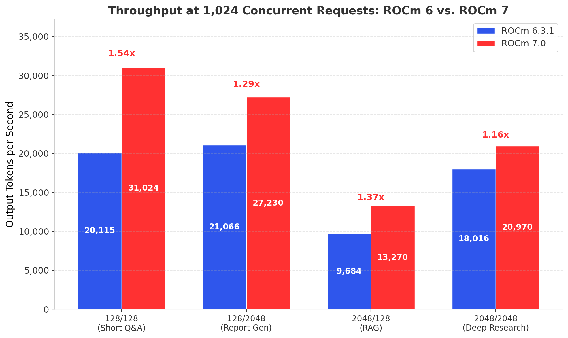 Averaged across all four scenarios at 1,024 concurrency, ROCm 7 delivers 1.34x the throughput of ROCm 6 on the same hardware. That is a 34% throughput increase from a software upgrade alone.
