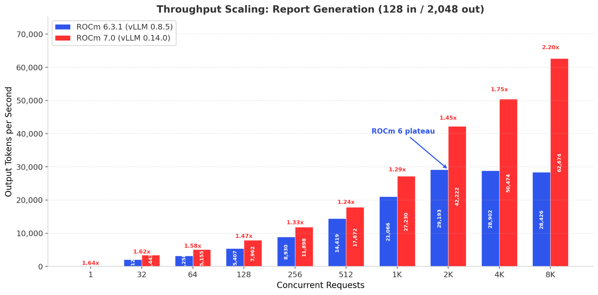 ROCm 7, by contrast, continues scaling. At 4,096 concurrency, the average gain across all scenarios reaches 1.64x. For the report generation workload at 8,192 concurrent requests, ROCm 7 delivers 62,674 TPS where ROCm 6 manages only 28,426, a 2.2x improvement.