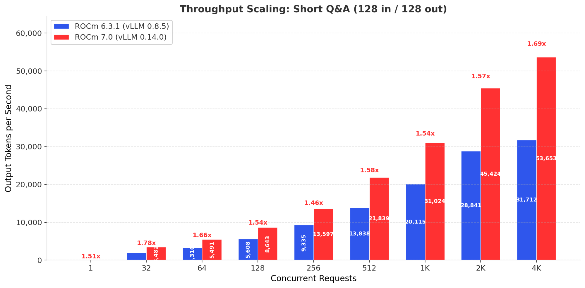 Figure 3 - Short Q&A Throughput Scaling: ROCm 7 leads at every concurrency level with widening advantage.