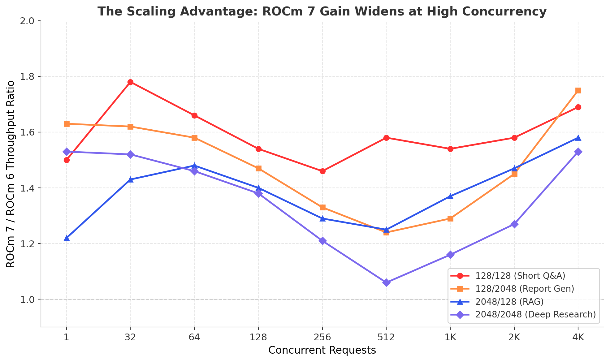 Figure 4 - The Scaling Advantage: ROCm 7 throughput gain ratio increases at high concurrency across all workloads.