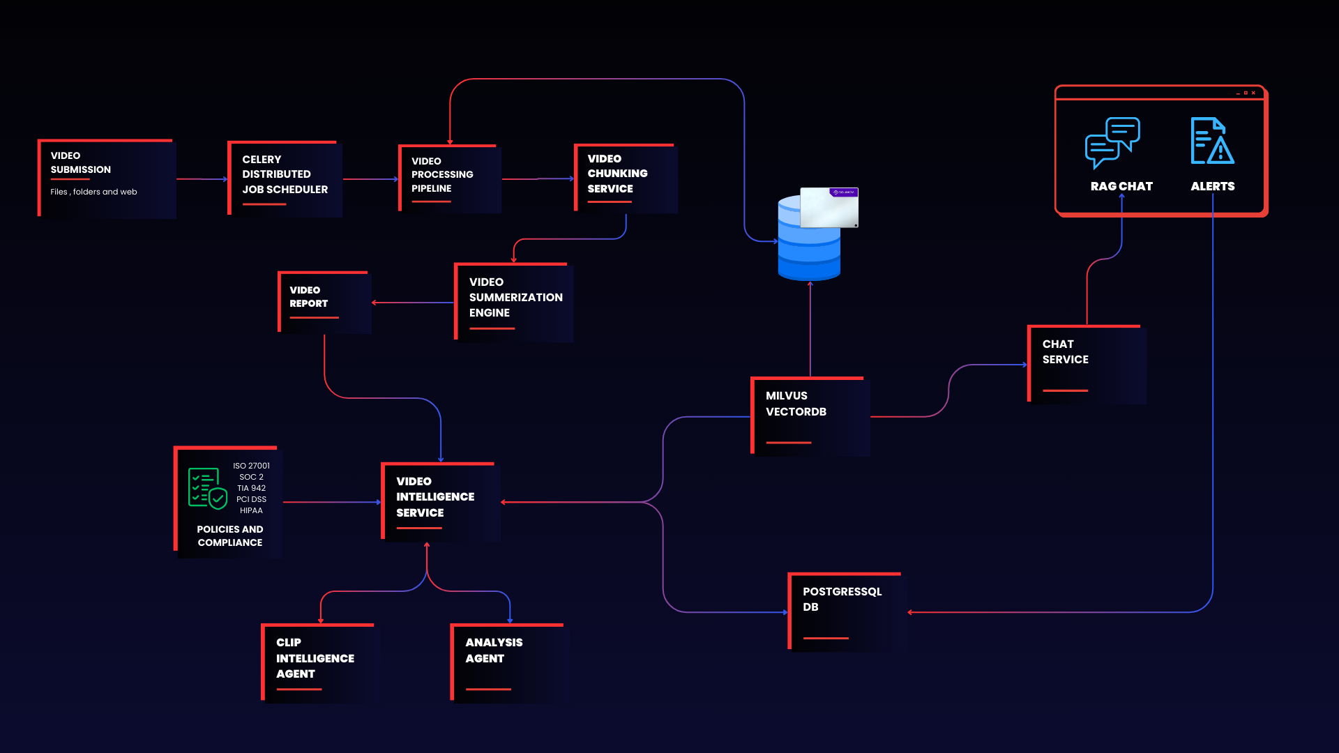 This three-phase design ensures consistent progression from raw video to actionable intelligence. Each phase maintains high throughput and responsiveness even under heavy concurrent load from multiple analysts and automated policy engines.