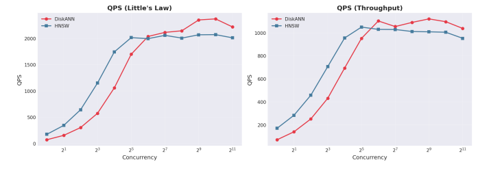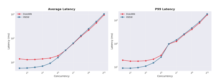 Throughput Scaling Behavior. Both indexing approaches scale query throughput as concurrency increases, but DiskANN maintains a consistent advantage across the tested range. At enterprise concurrency levels (512 to 1,024 threads), DiskANN continues scaling smoothly while HNSW begins plateauing. This scaling characteristic directly impacts system capacity planning: fewer servers required to support the same user population.
