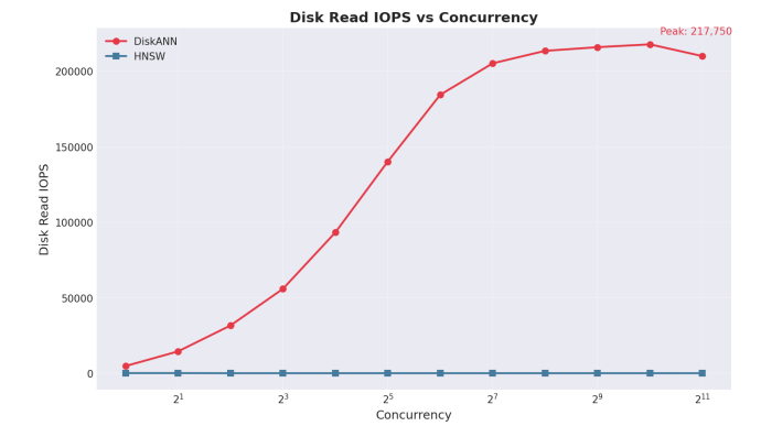 Storage Performance Under Load. DiskANN shifts index traversal from DRAM to NVMe storage, placing significant I/O demands on the storage layer. During benchmark testing, the Solidigm D7-PS1010 sustained 217,750 random read IOPS across 1,024 concurrent query threads. This I/O capacity enabled DiskANN to deliver 14% higher throughput and 13% lower latency than DRAM-bound HNSW, while reducing memory requirements. The D7-PS1010's PCIe 5.0 interface and optimized firmware prevent storage from becoming the bottleneck that would otherwise limit SSD-offloaded architectures.