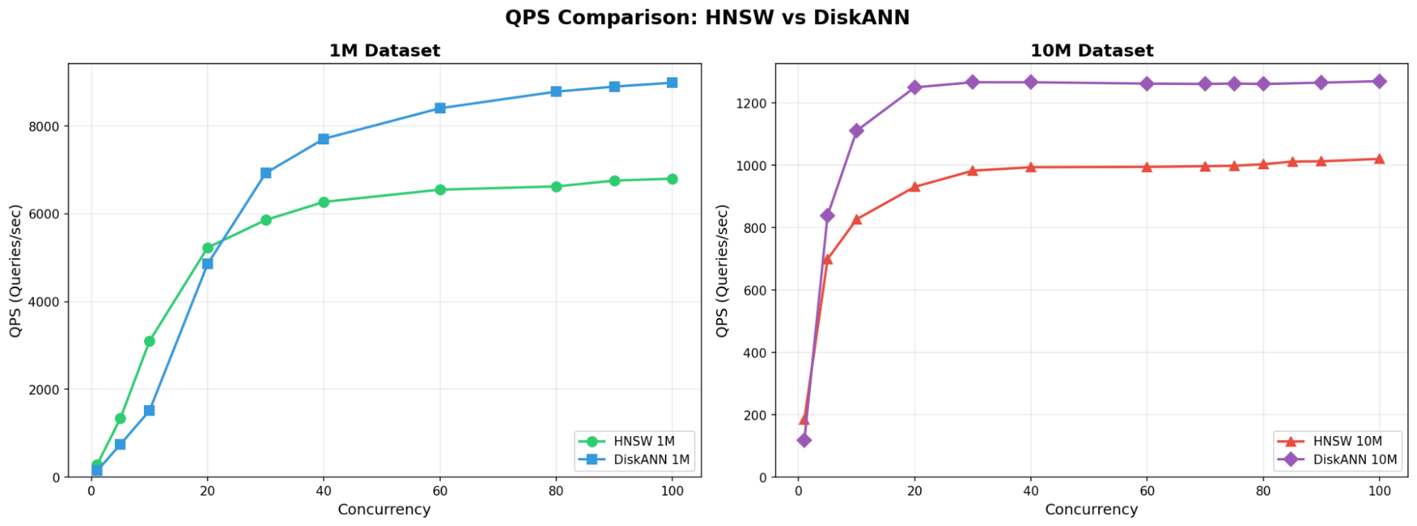 Figure 6 QPS vs Concurrency between HNSW and DiskANN at 1M and 10M