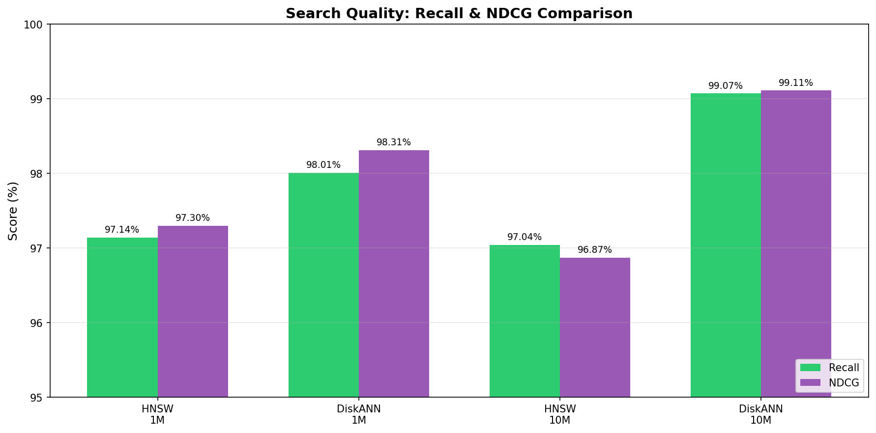 DiskANN maintained recall above 99% at the 100M scale, slightly exceeding HNSW accuracy. This demonstrates that SSD offloading does not compromise search quality. For production AI applications where retrieval precision directly affects user experience and analytical accuracy, these results confirm that cost optimization does not require quality tradeoffs.
